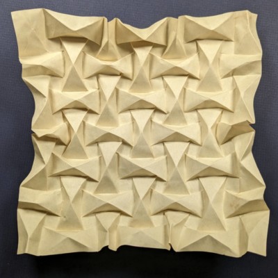 2x2x4 Waterbomb folded from 1 sheet of fish print paper mounted on identical fish print paper